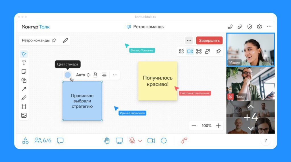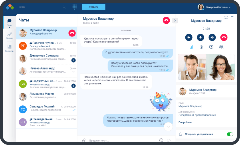 Форматы общения «от кружка до совещания»: быстрые переписки, презентации и конференции на сотни человек. Отличный выбор для формальных и регламентированных структур вроде финтеха или госсектора.