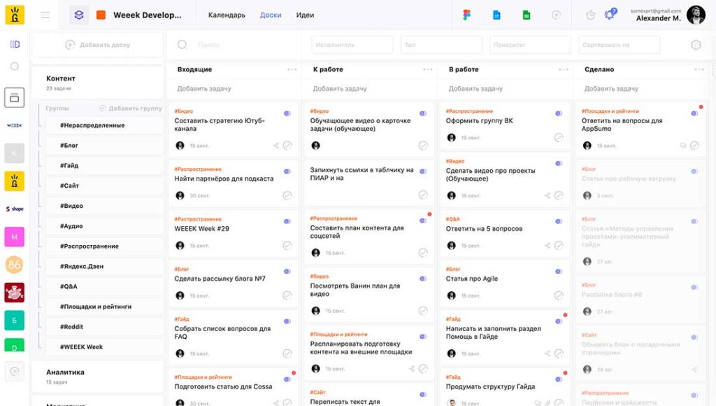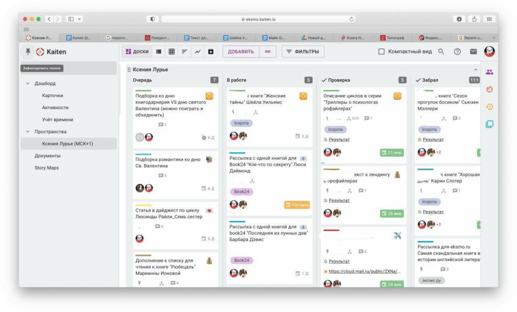 Гибкий интерфейс, удобно визуализировать кто что делает, даже если команда растянута по шести городам. Конкурент Kaiten, но с более кастомизируемым UI.