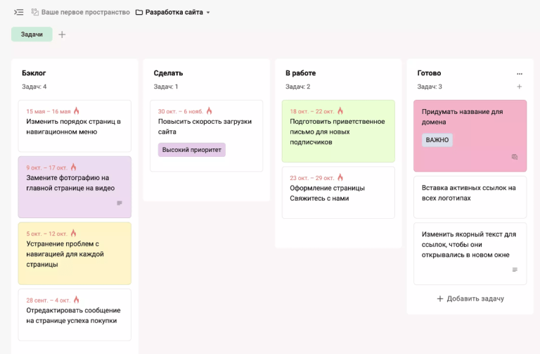 - Карточки задач: добавляешь описание, дедлайны, ответственных.