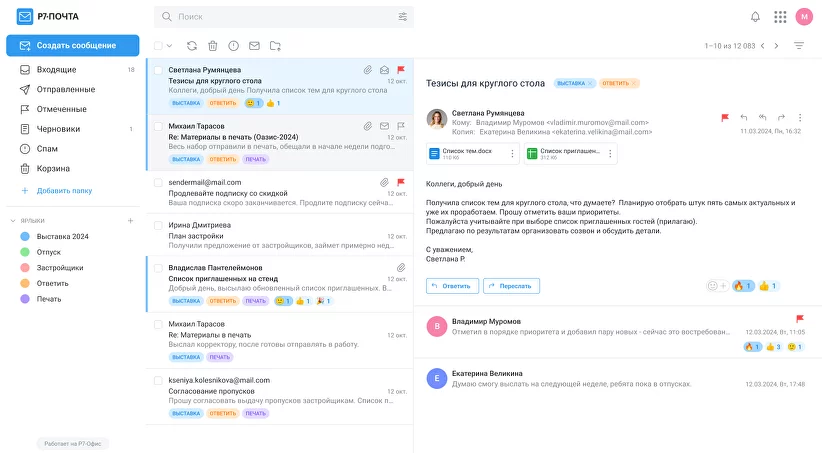 - Интеграция с диском, почтой, задачами, календарем и другими продуктами Р7.