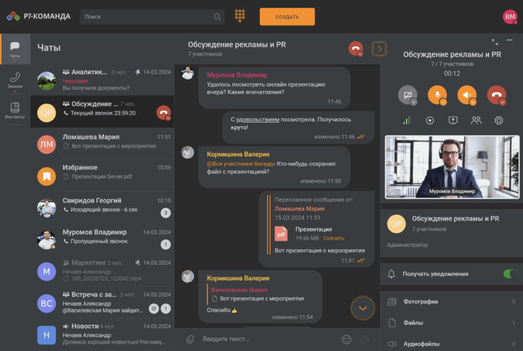 - Чаты и файлообмен: личные и групповые чаты, каналы, отправка фото, видео, документов, встроенная галерея и статус «прочитано».